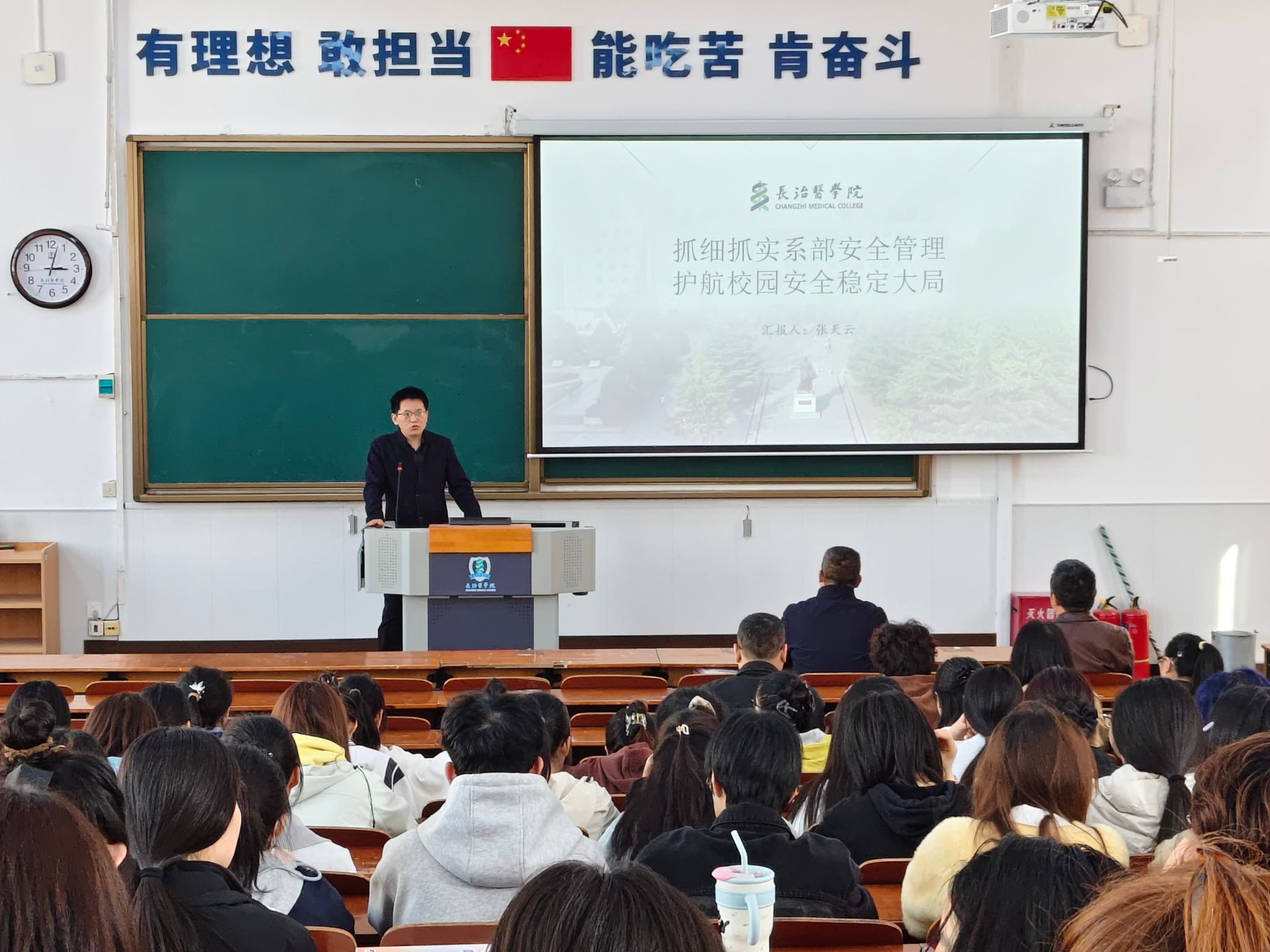校保卫部张天云部长以“抓细抓实系部安全管理 护航校园安全稳定大局”为题做了专题讲座,紧密围绕系部安全管理工作要点,结合校园安全工作实际状况,从四个关键维度即强化安全意识、明确核心责任,聚焦关键领域、精准防范风险,完善工作机制、筑牢制度防线,强化隐患预判、提升应急能力,进行了全面、细致且深入的剖析讲解。他强调,要树立前瞻性思维,下好安全工作的“先手棋”,同时通过加强应急演练和培训,提升全体教职工应对安全突发事件的处置能力,确保在关键时刻能够迅速、有效地应对。